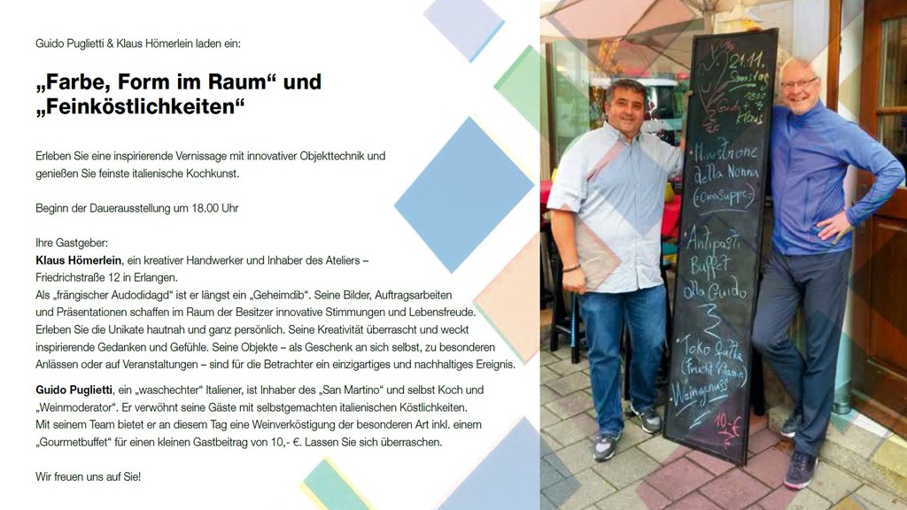 Mehr als 80 Teilnehmer haben im "San Martino" die Dauerausstellung und den Stammsitz meiner Galerie eröffnet. Das "San Martino" befindet sich in der Schuhstrasse 10, schräg gegenüber dem Atelier-Friedrichstrasse12.